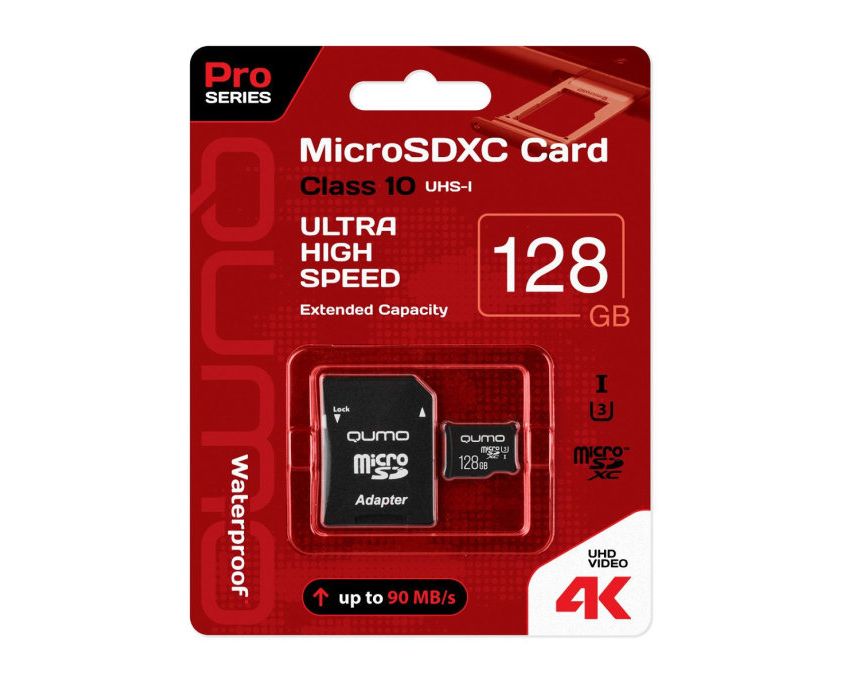 Карта памяти Qumo 128Gb QM128GMICSDXC10U3 90/70 МБ/с UHS-I U3, Pro seria 3.0 с адаптером SD