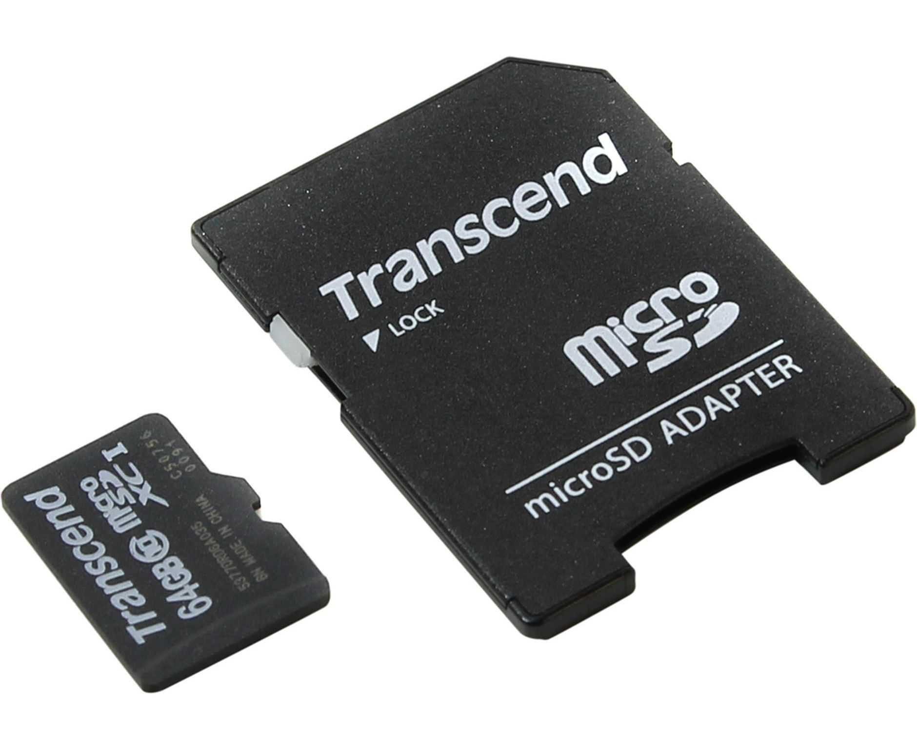 Карта памяти microSDXC Transcend, 64 Гб, UHS-I Class U1, чтение: до 45Мб/с, с адаптером