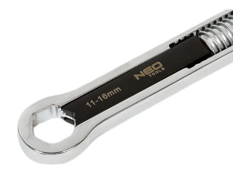 NEO Tools Разводной ключ 5 - 16 мм двойное кольцо 03-030 изготовлен из высокосортной хромованадиевой стали, отличатся долголетней прочностью. Наличие пружины позволяет подобрать ключ к разным размерам крепежа. Гарантией высокого качества и надежности инструмента является сертификат TÜV Rheinland.0