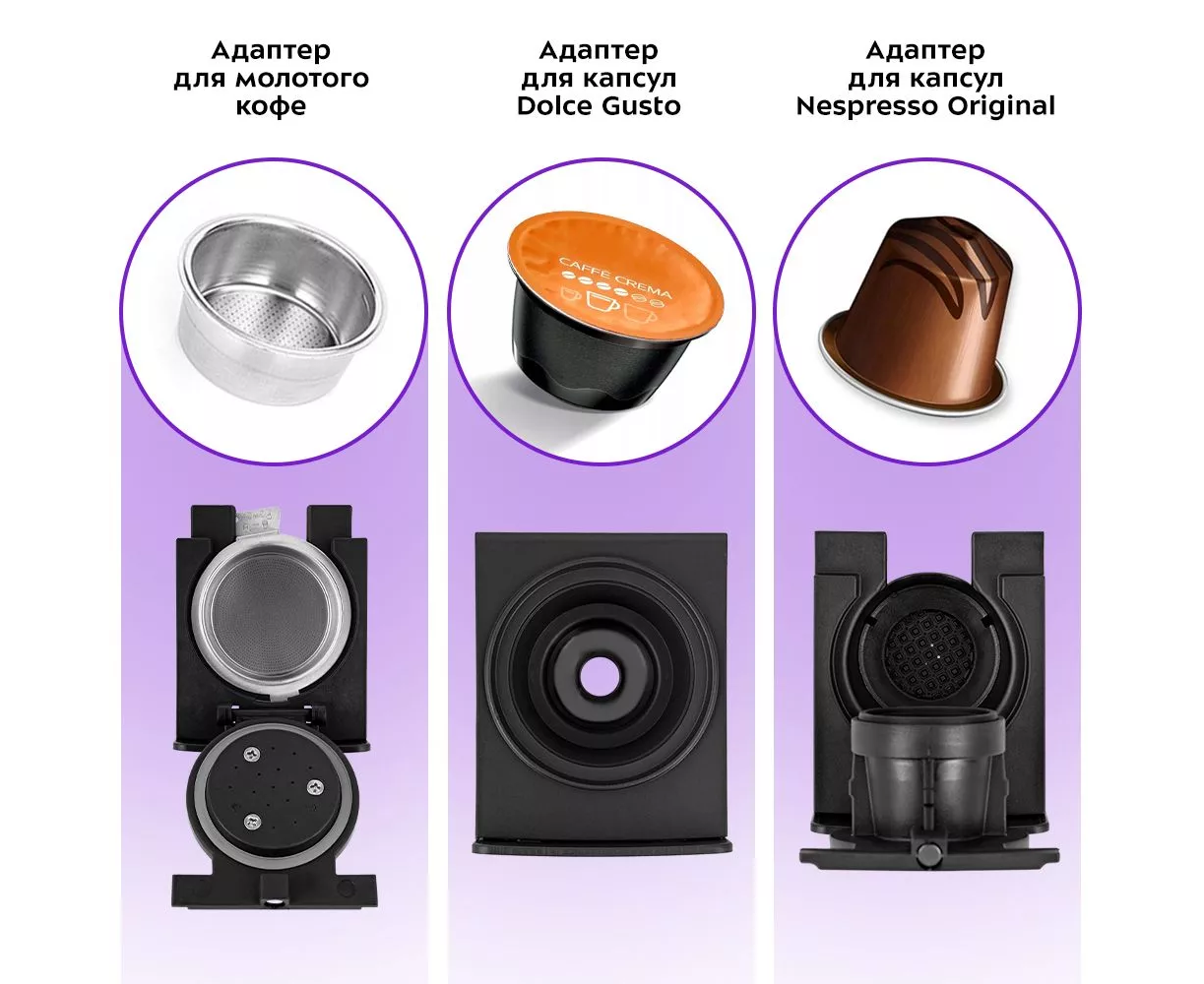 Капсульные кофеварки позволяют сделать процесс приготовления удобным. Необходимо просто поместить капсулу в адаптер, а адаптер - в кофеварку. В комплекте идут 2 адаптера для капсул типа Nespresso Original и Dolce Gusto. Экспериментируйте со вкусом!