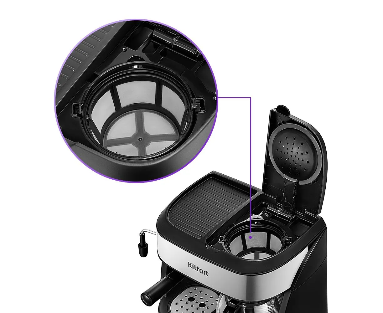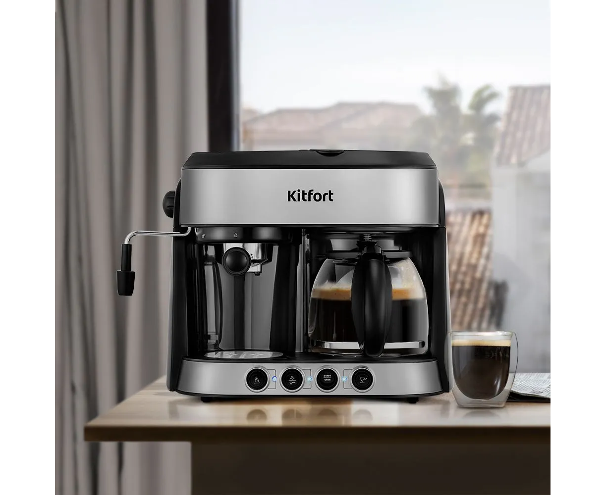 Кофейная станция Kitfort KT-7185 совмещает в себе два вида кофеварок: рожковая и капельная.