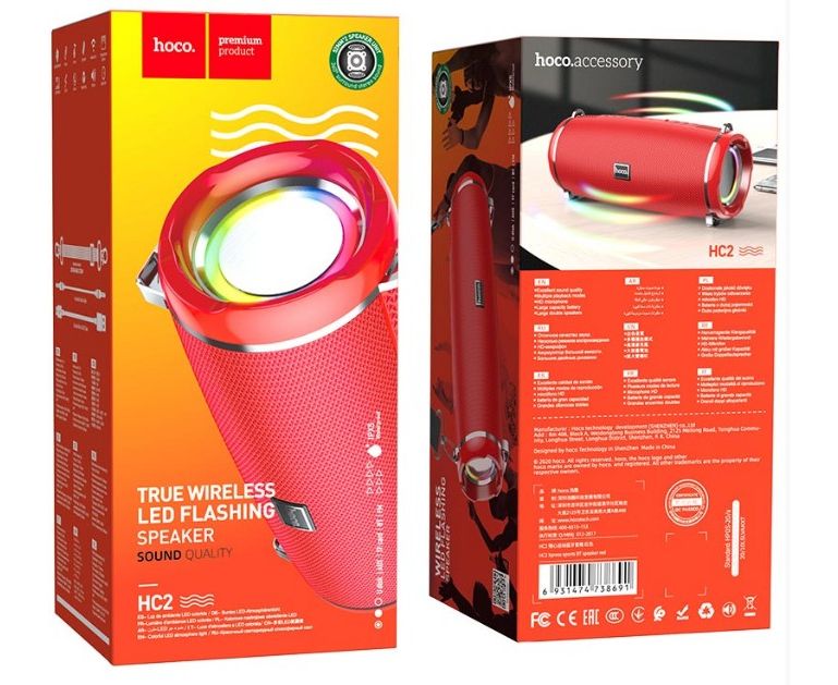 Колонка с поддержкой Bluetooth V5.0 Hoco HC2 Xpress включает в себя 2 динамика диаметром 52 мм и мощностью 5 Вт каждый, работает от аккумулятора емкостью 2400 мАч. Время работы - до 6 часов, зарядки - до 3 часов. Поддерживает режим FM-радио, проигрывание с карты памяти, есть разъем AUX 3.5mm. Размеры 194,4 х 81 х 82 мм, вес: 598 г. Пластиковый корпус покрыт тканью, динамик окружен светодиодным кольцом, к колонке можно присоединить ремешок для переноски. Колонка представлена в пяти цветах - черный, синий, зеленый, зеленый камуфляж, красный.