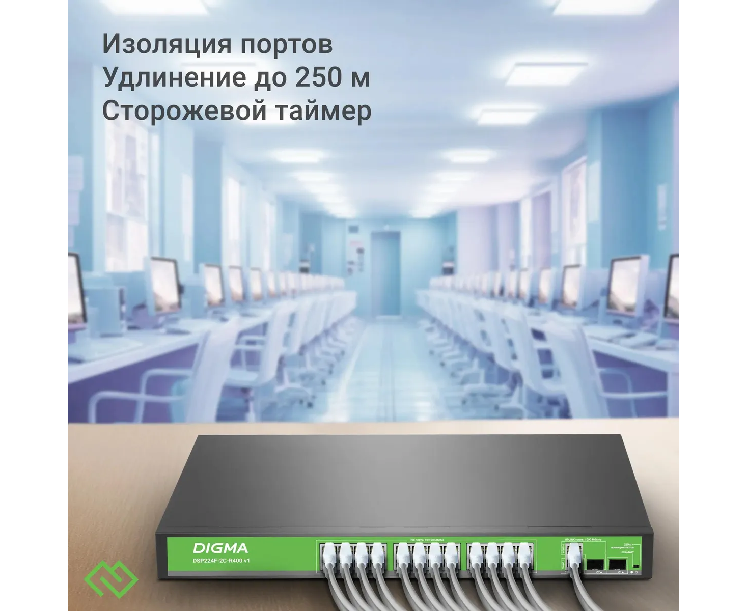 Коммутатор неуправляемый Digma DSP224F-2C-R400 V1 (L2) 24x100Мбит/с 2xКомбо (1000BASE-T/SFP) 24PoE 24PoE+ 400W