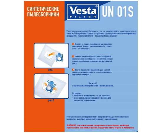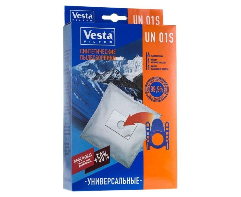 Мешки для пылесосов Vesta filter UN01S для ЛЮБЫХ бытовых пылесосов. Мешки с клейкой основой , используются в случае наличия рамки от оригинального мешка, которую потребуется приклеить на мешок из набора UN 01 S. Произведены из синтетического микроволокна, обладают высокоэффективным качеством фильтрации в 99.9 % (0.3 микрон), обеспечивают очистку воздуха выходящего из пылесоса. Благодаря синтетическому материалу мешки VESTA FILTER UN 01S не боятся воды и острых предметов, сохраняют мощность пылесоса при заполнении, вмещают в себя больше содержимого чем мешки из бумаги. В комплектацию входят 4 пылесборника , 1 фильтр моторного отсека и 1 фильтр выходящего воздуха.