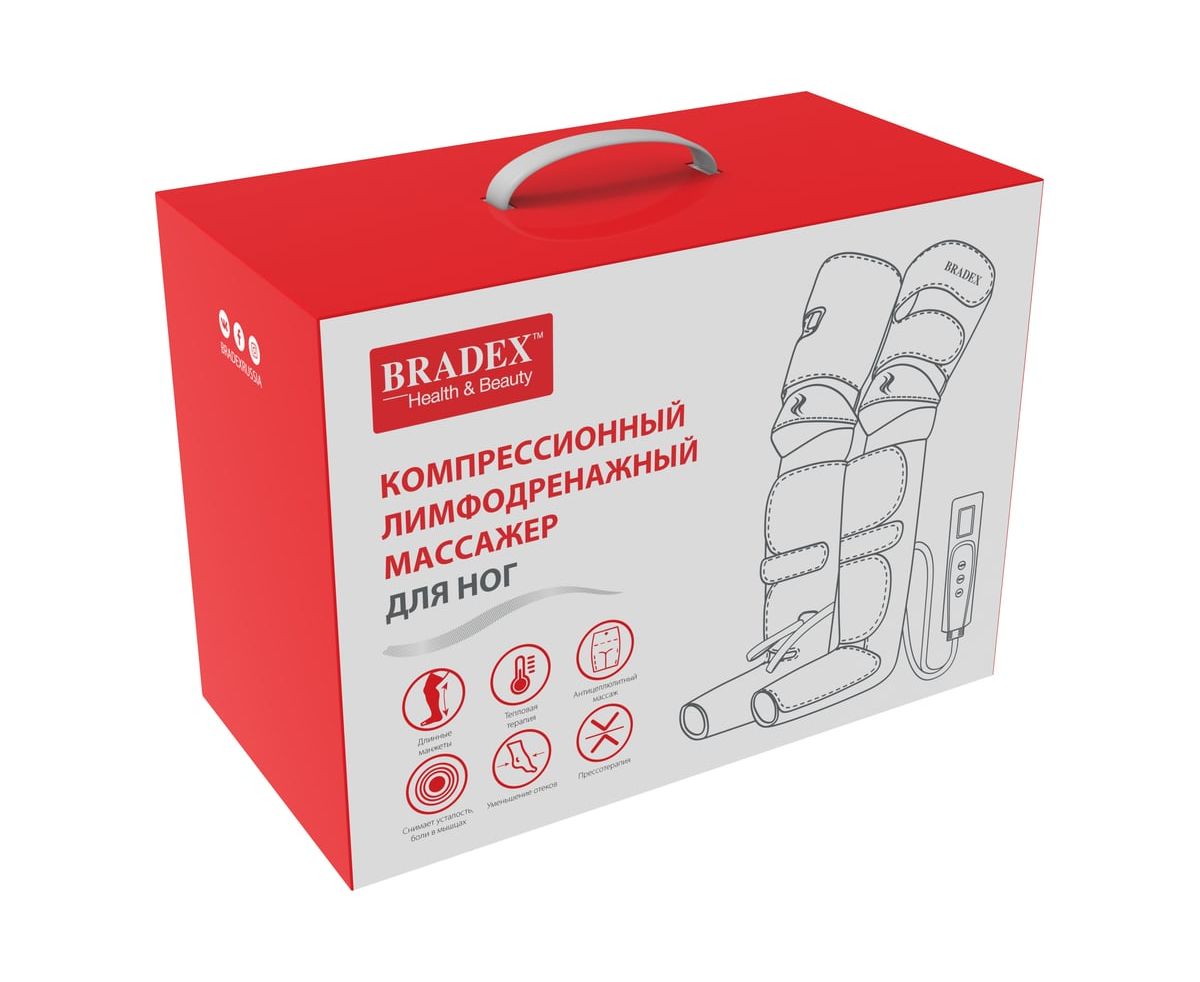 Компрессионный лимфодренажный массажер для ног BRADEX прогрев коленей, длинные манжеты, черный KZ 1167 – профессиональное устройство для проведения прессотерапии и лимфодренажа ног с дополнительной функцией подогрева в области коленей в домашних условиях.