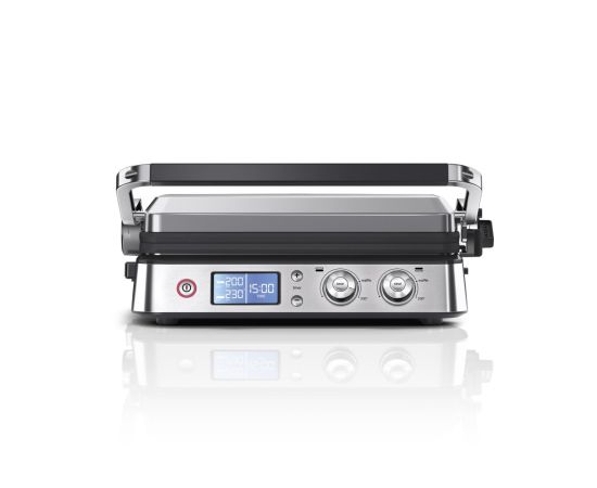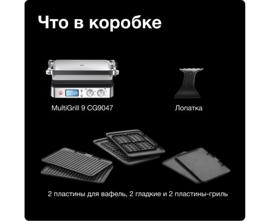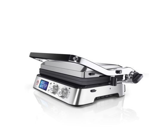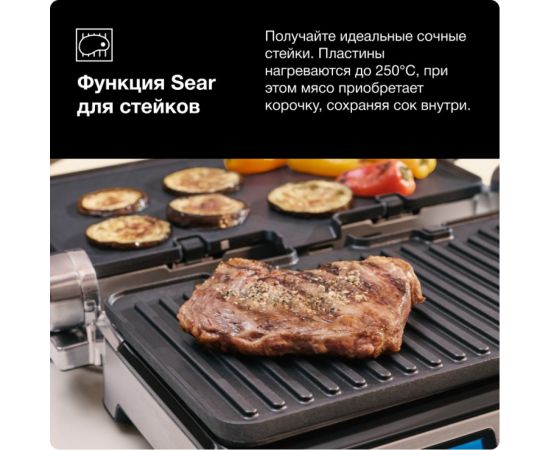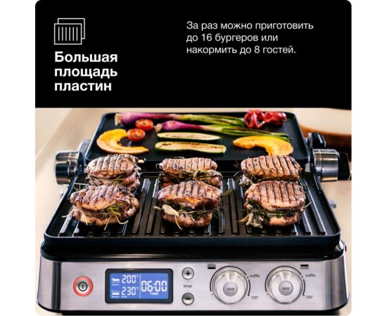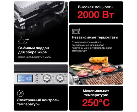 Электрогриль Braun CG9047 позволяет приготовить любые продукты: стейки, колбаски, гамбургеры, овощи или рыбу. Использование прибора простое и понятное: вся необходимая информация указана на дисплее. Эта модель работает в трех режимах: контактный гриль (с закрытой крышкой), открытая жаровня (крышка откинута) и «гриль-печь» (верхняя панель приподнята над нижней). Температура нагрева задается в диапазоне от 60 до 230 градусов отдельно для каждой поверхности при помощи поворотных регуляторов. Прибор оповестит о готовности к работе звуковым сигналом – пора приступать к закладке продуктов! Электрогриль оснащен нагревательными элементами с двух сторон, что обеспечивает равномерную прожарку блюд и румяную корочку. Наклон крышки можно регулировать.