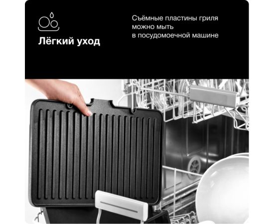 Корпус гриля выполнен из нержавеющей стали и термопластичного пластика — прибор сохраняет свой внешний вид даже при интенсивном использовании, легко очищается. Ручки не нагреваются. Съемные панели с антипригарным покрытием, их разрешено мыть в посудомоечной машине, изделия устойчивы к царапинам и деформации. В комплекте две рифленые и две гладкие панели , лопатка для очищения, а также емкость для сбора стекающего жира. Компактный прибор не занимает много места.