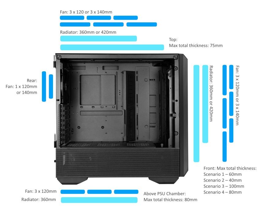 3 x 140 мм на верхней панели, 140 мм на задней панели, 3 x 140 мм на передней панели, 3 x 120 мм на нижней панели