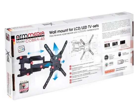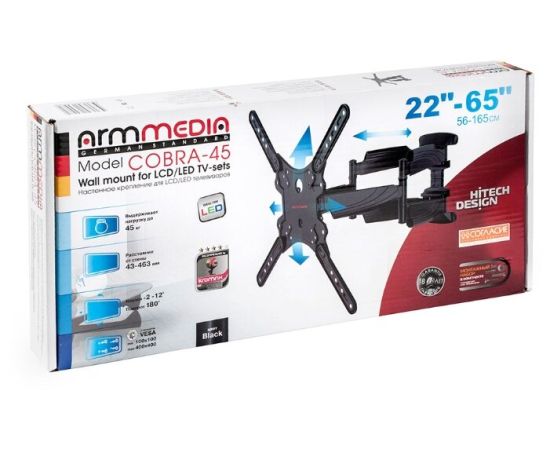 22"-65" Кронштейн Arm media COBRA-45 new black Наклонно-поворотный max 45 кг, 4ст св., нак. + 5° -10°, пов. 160°, от ст. 45-495 мм., max VESA 400x400