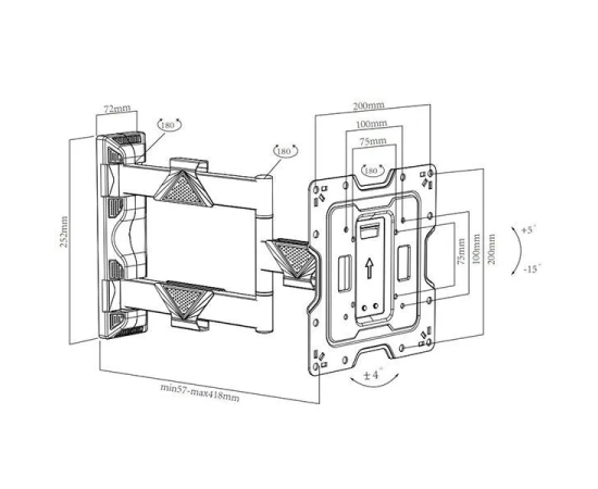 Даже учитывая широкие возможности движения, кронштейн крайне компактен в сложенном состоянии, благодаря продуманному механизму складывания; Система организации проводов – Кабель-канал позволяет зафиксировать провода для удобства и эстетической красоты; Возможность гибкой регулировки – Три надёжных осевых соединения обеспечивают возможность манёвренного поворота на угол до 180° и вылета от стены от 53 до 400 мм; Лёгкая регулировка наклона – Надёжная конструкция без особых усилий позволит осуществить наклон даже тяжёлого телевизора лёгким движением на угол до +10°.