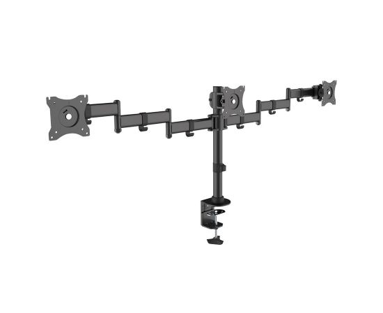 Описание: Универсальное настольное крепление с горизонтальным размещением трех мониторов в один ряд. Кабель-каналы. Два варианта установки на столешницу: за край стола и на поверхность стола.