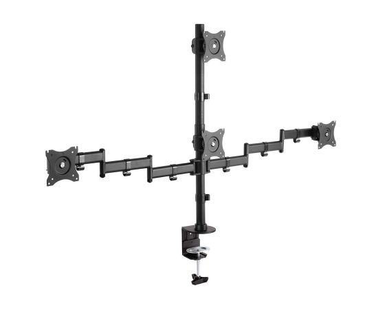 Описание: Универсальное настольное крепление с горизонтальным размещением 4 мониторов. Два варианта установки на столешницу: за край стола и на поверхность стола. Кабель-каналы.