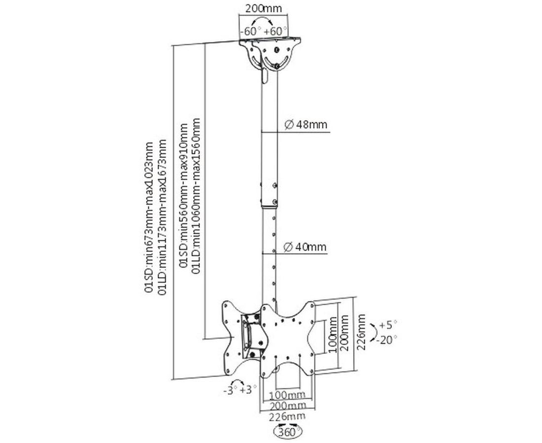 Описание Потолочный кронштейн для LCD/LED телевизоров размером от 15 до 48 дюймов с максимальным весом до 2×45 кг. с возможностью крепления на наклонный потолок. Надежная стальная конструкция. Регулировка наклона +5 -20 и углом поворота ±180 градусов. Максимальные крепежные размеры 200×200 мм.