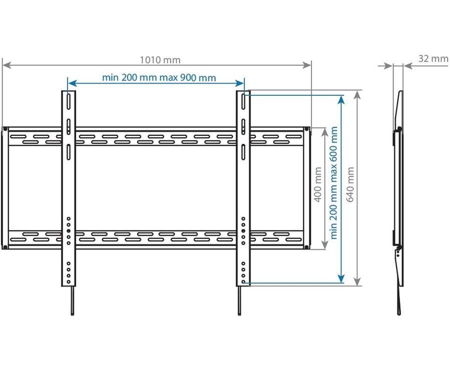 Особенности Универсальная система крепления: по горизонтали от 200 мм до 900 мм, по вертикали от 200 мм до 600 мм.