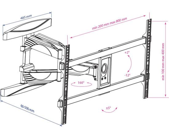 40"-90" Кронштейн Kromax ATLANTIS-65 black Наклонно-поворотный max 45 кг. 4 ст св., нак. +2° -12°, пов. 160°, от ст. 60-500 мм., max VESA 800x400 м