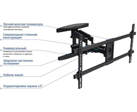 Особенности: Легкий монтаж телевизора благодаря наличию съемной монтажной пластины, корректировка экрана ±5 градусов, широкое настенное основание, сверхмощная стальная конструкция.