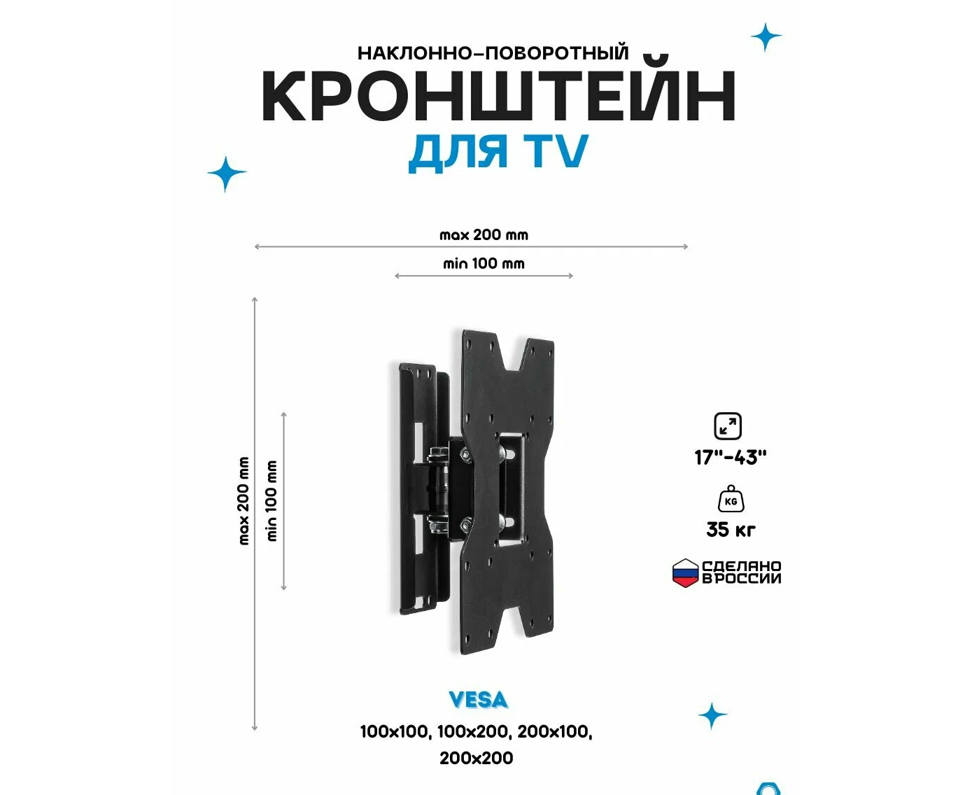 Размеры крепления стандарта Vesa; 100х100, 200*100, 200*200 мм