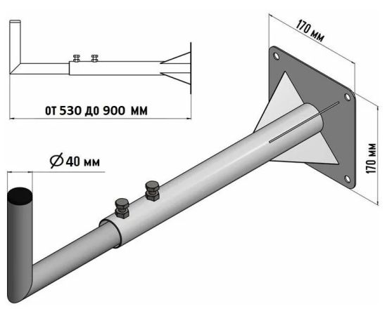 Кронштейн телескопический, применяется для установки антенн и спутниковых тарелок на балконы, оконные рамы, стены строений, фасады зданий и сооружения. Регулировка выноса кронштейна позволяет подобрать необходимый вылет крепления антенны или спутниковой тарелки к стене. Крепление антенны или спутниковой на кронштейн поможет существенно улучшить качество принимаемого сигнала и избавит от помех вносимых различными электронными устройствами, а также стенами и крышами домов. Кронштейн изготовлен из стали, окрашенной порошковой краской, что обеспечит долговечную службу в неблагоприятных условиях окружающей среды. Изготовлен с учетом специфики Российского климата. Вылет от стены: от 60 см до 110 см Конструкция: телескопическая Производство: Россия.