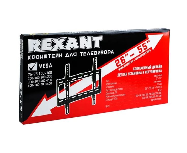 26"-55" Кронштейн DVT 38-0330 REXANT Наклонно-поворотный для ЖК, VESA 75*75, 100*100, 200*200, 300*300, 400*400 Нагрузка до: 35кг
