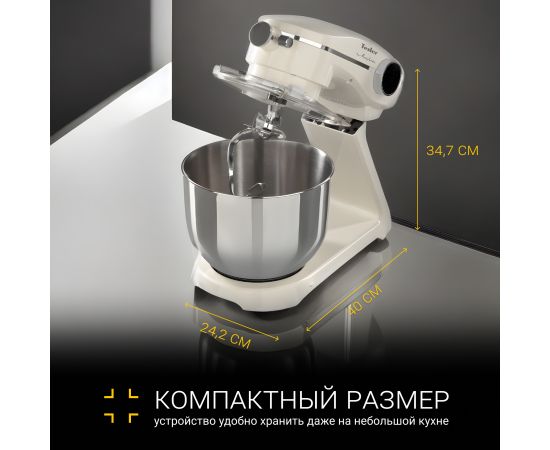 С помощью идущих комплекте аксессуаров вы сможете быстро и эффективно соединять различные ингредиенты. Крюк для замешивания предназначен для приготовления густого теста для пирогов, хлеба и другой выпечки. Насадка для перемешивания подойдёт для смесей средней вязкости, таких как овощные пюре и соусы. Венчик будет полезен для взбивания яиц, сливок, кремов, чтобы придать им воздушность и объем. Конструкция планетарного миксера позволяет взбить венчиком даже 1 яйцо, чтобы приготовить небольшую порцию. Все насадки изготовлены из прочной нержавеющей стали.