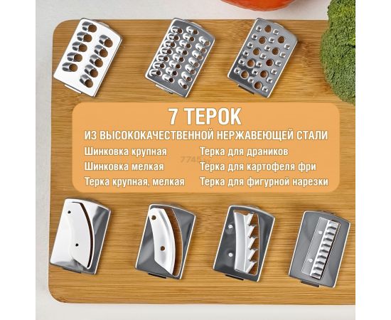 Тип кухонный комбайн Мощность 800 Вт Материал корпуса металл/пластик Объем чаши 2 л Материал чаши пластик Объем блендера 1,8 л Материал блендера пластик Количество скоростей 2 Максимальная скорость вращения 18000 об/мин Импульсный режим есть Защита от перегрузки есть Прорезиненные ножки есть Цвет черный, серебристый Отсек для хранения шнура есть Комплектация Моторная часть Чаша чоппера Насадка для крупной шинковки Насадка для мелкой шинковки Крупная терка Мелкая терка Терка для драников Терка для картофеля фри Терка для фигурной нарезки Нож-измельчитель Насадка для замешивания теста Насадка для приготовления эмульсий Насадка для взбивания Блендер 1,8 л Соковыжималка для цитрусовых Кофемолка/мельница для круп 0,25 л Инструкция
