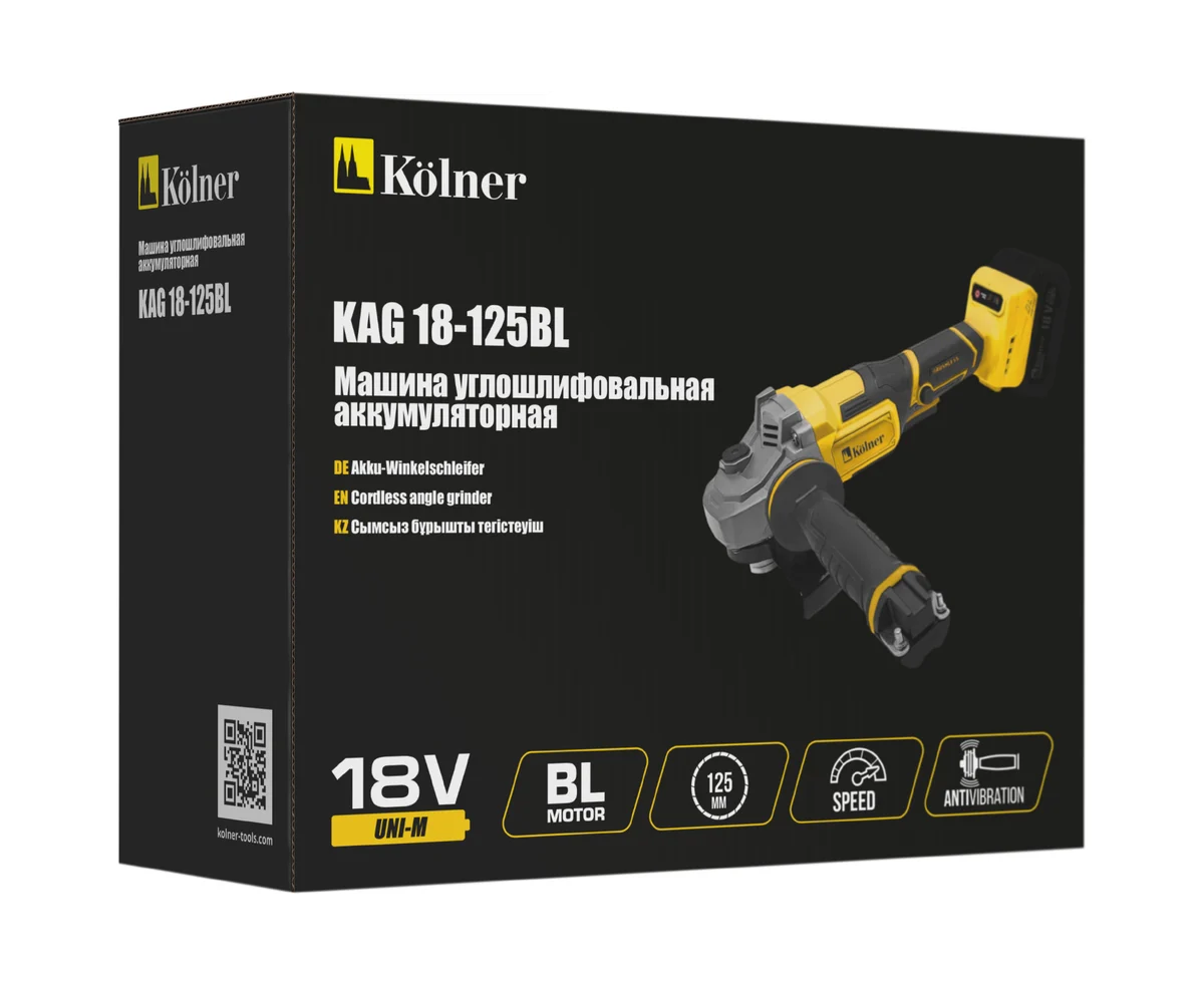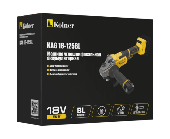 Машина углошлифовальная аккуммуляторная Kolner KAG 18-125BL 18V UNI-M, BL, 125мм,, 5200-7500об/мин, быстрозажим.кожух, AV рукоятка (без акб и зу)
