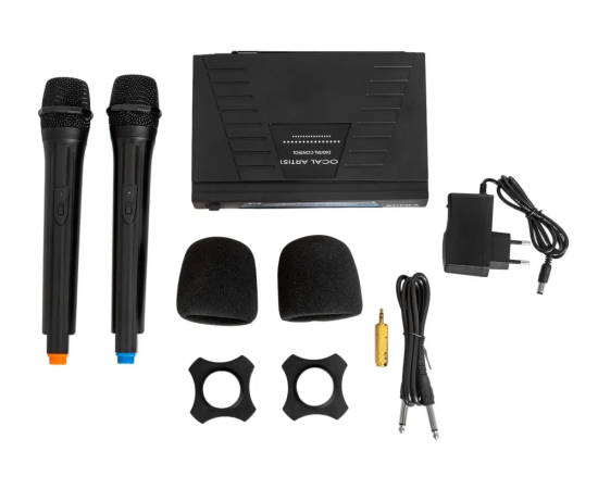 Комплектация ручной микрофон (2 шт.), приемник сигнала с микрофонов, адаптер питания приемника, аудиокабель 6,3 мм – 6,3 мм, поддерживающее кольцо микрофона (2 шт.), ветрозащитный колпак микрофона (2 шт.), переходник 6,3 мм в 3,5 мм, гарантийный талон, инструкция пользователя