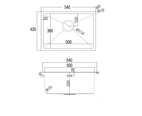 Имеет R5 радиус закругления с внешней стороны. Внутренние углы с R10 радиусом закругления.