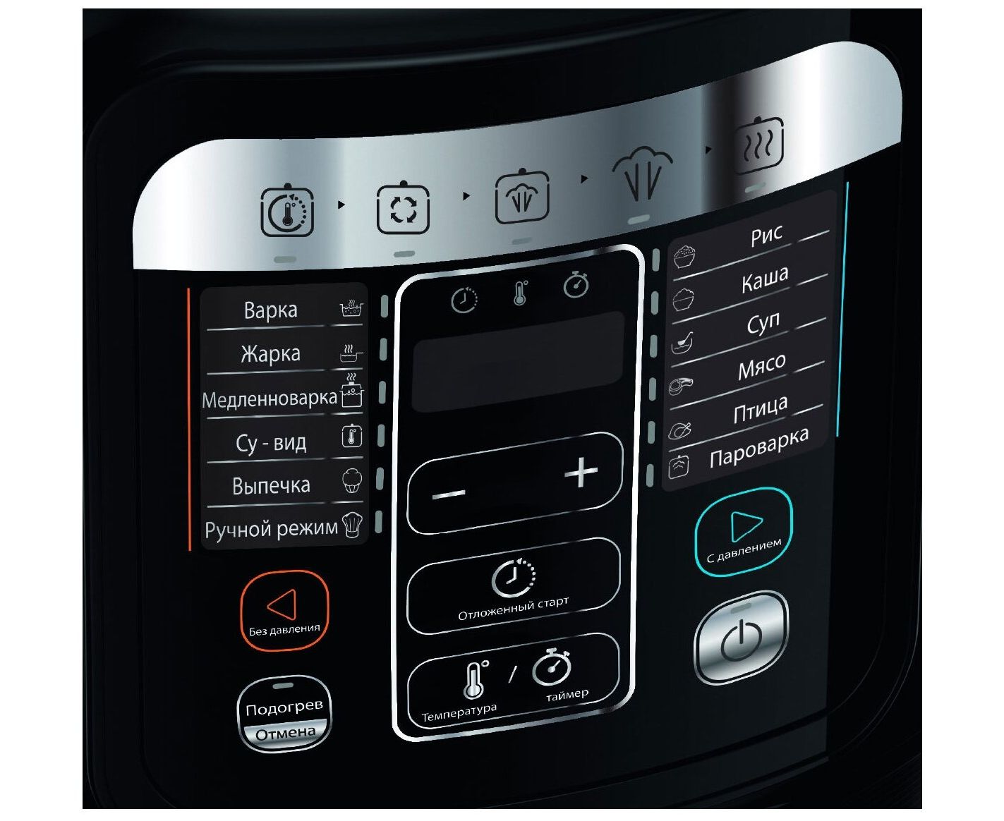 варка, выпечка, жарка, запекание, йогурт, крупа, молочная каша, мультиповар, мясо, приготовление на пару, суп, тушение, Отложенный старт, быстрый рис, говядина/баранина, загустение соуса, курица/утка, отложенный старт, подогрев, регулировка температуры, соте/обжарка, су-вид