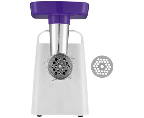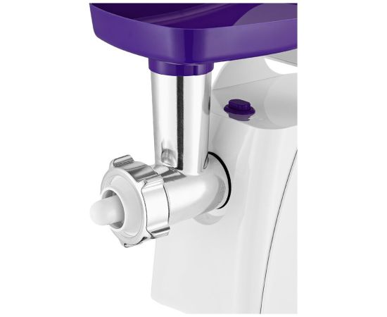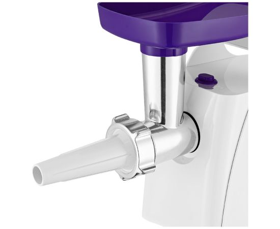 Мясорубка оснащена мощным мотором. Корпус устройства выполнен из пластика. Задние ножки мясорубки с присосками, что повышает устойчивость устройства во время работы. Производительность мясорубки - 1,1 кг фарша в минуту.