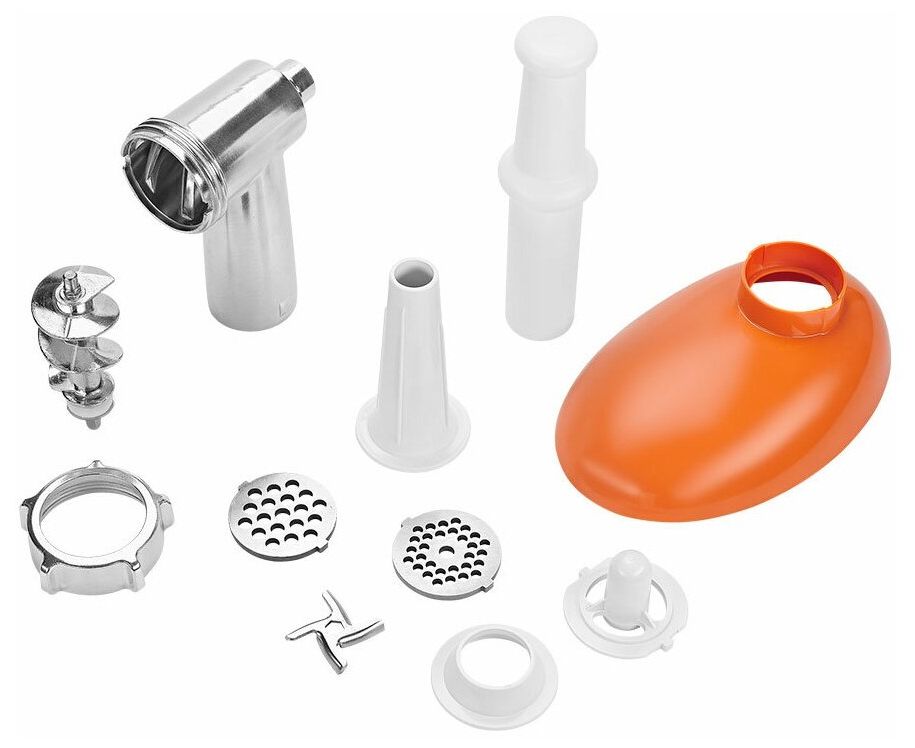 Комплектация 1. Моторный блок — 1 шт. 2. Загрузочный блок — 1 шт. 3. Загрузочный лоток — 1 шт. 4. Толкатель — 1 шт. 5. Шнек — 1 шт. 6. Насадка для кеббе — 1 шт. 7. Крышка насадки для кеббе — 1 шт. 8. Насадка для колбас — 1 шт. 9. Нож — 1 шт. 10. Кольцевая гайка — 1 шт. 11. Решетка с отверстиями 5 мм — 1 шт. 12. Решетка с отверстиями 7 мм — 1 шт. 13. Руководство по эксплуатации — 1 шт. 14. Коллекционный магнит — 1 шт.* *опционально
