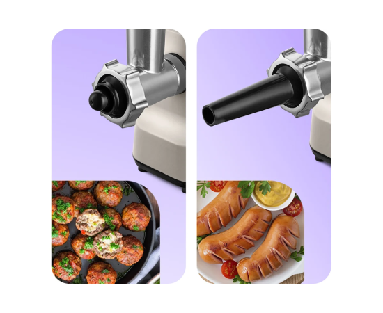 Технические характеристики Мощность 800 Вт Материал корпуса пластик Материал лотка пластик Материал шестерней металл Время непрерывной работы 0.17 ч Длина сетевого шнура 0.8 м Цвет бежевый Количество насадок в комплекте 2 шт Вес нетто 1.8 кг Защита двигателя от перегрузки нет Отсек для хранения шнура нет Насадка для нарезки кубиками нет Насадка-терка нет Насадка для шинкования нет Насадка для приготовления колбас да Насадка-соковыжималка нет Насадка для кеббе да Насадка для нарезки печенья нет Количество перфорированных дисков для фарша 2 шт Отсек для хранения насадок нет Количество скоростей 1 шт Нескользящее основание да Производительность 1.2 кг/мин Наличие реверса да Габариты без упаковки 255 × 125 × 300 мм