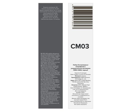 Набор беспроводных микрофонов PERO CM03. Емкость аккумулятора: 50 мАч. Время в режиме работы: до 4 часов. Рабочее расстояние: ≤ 20 метров. Соотношение сигнал/шум: адаптивное шумоподавление 64 дБм. Цвет: черный.