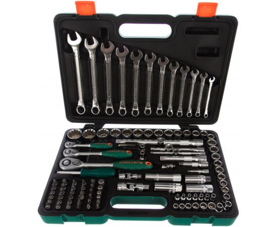 Универсальный набор инструмента состоит из 111 предметов. Большой ассортимент инструментов позволяет выполнять широкий спектр работ. Все насадки имеют хромовое покрытие для предотвращения появления коррозии, что увеличивает их срок службы.