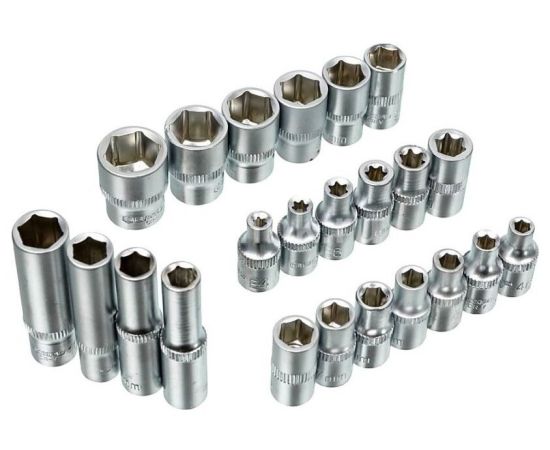 1/4": 4, 4.5, 5, 5.5, 6, 7, 8, 9, 10, 11, 12, 13, 14 мм; длинные 1/4": 6, 7, 8, 10 мм; Torx 1/4": E4, E5, E6, E7, E8, E10; с битами 1/4": Т8, T10, Т15, Т20, Т25, Т27, Т30, Т40, H3, H4, H5, H6, H7, H8, H10, SL4, SL5.5, SL6,5 PH1, PH2, PH3, PZ1, PZ2, PZ3