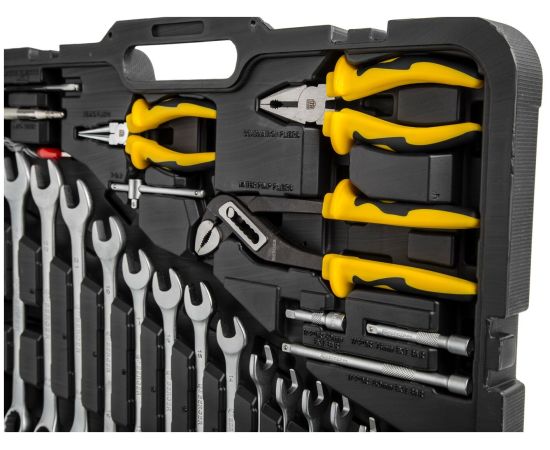 в комплекте: 1/4": трещотка (ключ трещоточный с быстрым сбросом) 45 зубов: 150 мм, вороток Т-образный: 110 мм, отвертка с присоединительным квадратом: 150 мм, удлинитель: 50, 75, 150 мм, удлинитель гибкий: 150 мм, кардан шарнирный, адаптер для бит; 1/2": трещотка (ключ трещоточный с быстрым сбросом) 45 зубов: 260 мм, вороток Т-образный с бегунком: 250 мм, вороток шарнирный: 375 мм, удлинитель: 50, 125, 250 мм, кардан шарнирный, переходник скользящий для удлинителей; 5/16": адаптер для бит; ручка магнитная телескопическая: 125-630 мм, автотестер 6-12-24 V; тип стали инструмента: CR-V (хром-ванадий); материал ручек инструмента: резинопластик; тип стали бит: S2