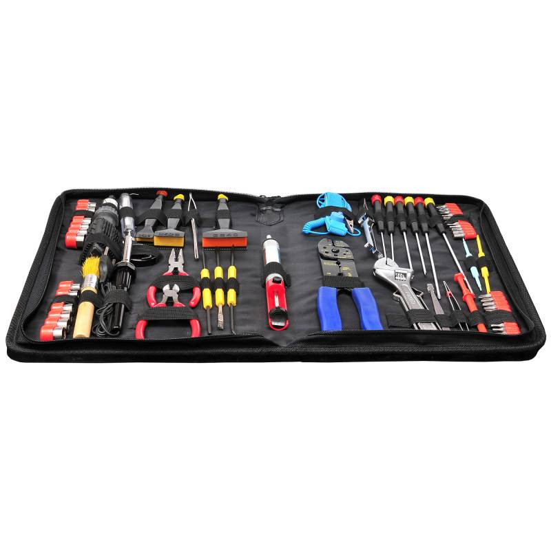 - реверсивная рукоятка для бит; адаптер-переходник для головок; инструмент для разделки кабеля; 3 инсертера для микросхем; 2 экстрактора для микросхем; паяльник; отсос; набор для пайки с флюсом; зацеп; подставка для паяльника; припой; антистатический браслет; 2 пинцета; кисточка