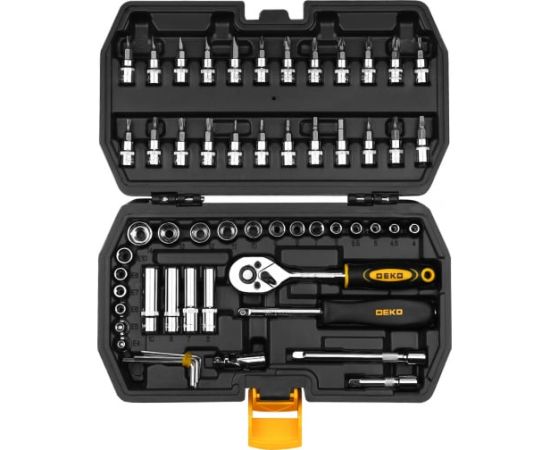 Набор инструментов для авто в чемодане, 57 предметов представляет собой качественный инструмент для монтажных и демонтажных работ с разными типами крепежа. Противоскользящее покрытие рукояток обеспечивает максимальный комфорт во время использования.