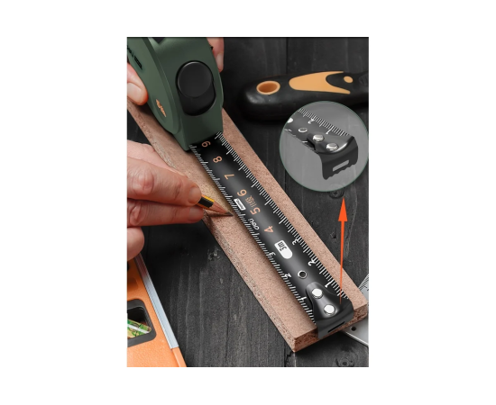 Кнопка-стопор позволяет зафиксировать полотно на необходимой длине, а на обратной стороне рулетки присутствует специальная резиновая противоскользящая вставка, надёжно удерживая её даже на поверхности с небольшим уклоном.
