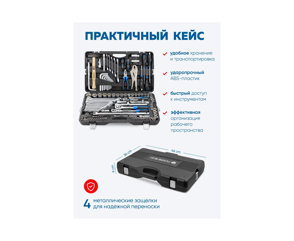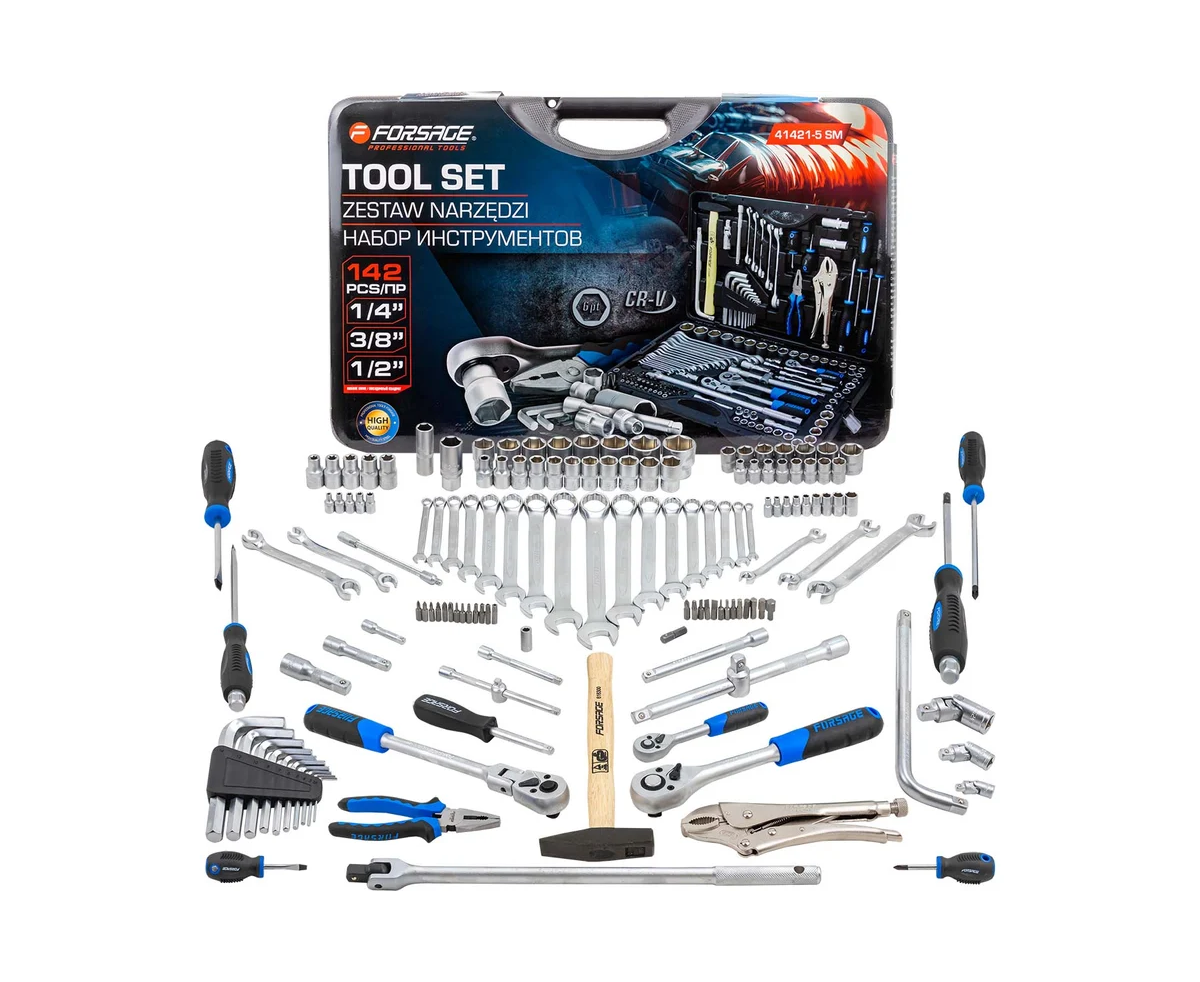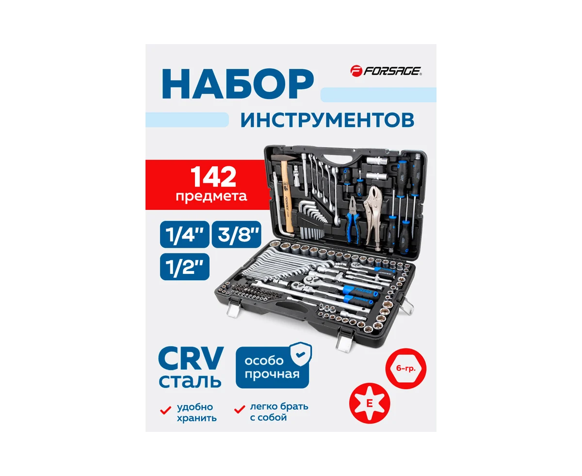 Набор инструментов Forsage из 142 предметов — это универсальный комплект, который станет незаменимым помощником в любой мастерской, на СТО, в гараже, на даче, в дороге и даже в быту. Благодаря высокому качеству и разнообразию инструментов, этот набор идеально подходит как для профессионалов, так и для автолюбителей, домашних мастеров и строителей.