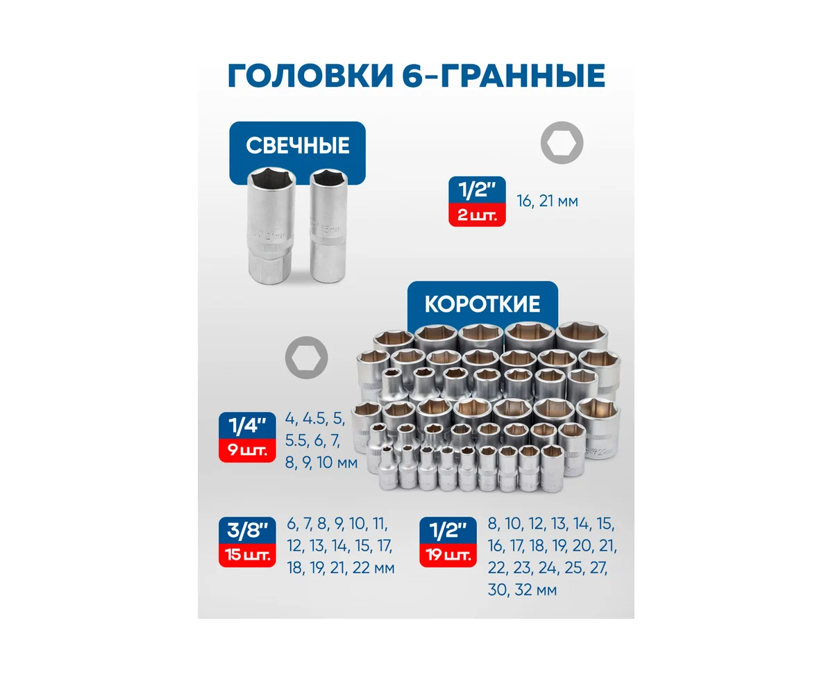- Головки: 6, 7, 8, 9, 10, 11, 12, 13, 14, 15, 17, 18, 19, 21, 22 мм