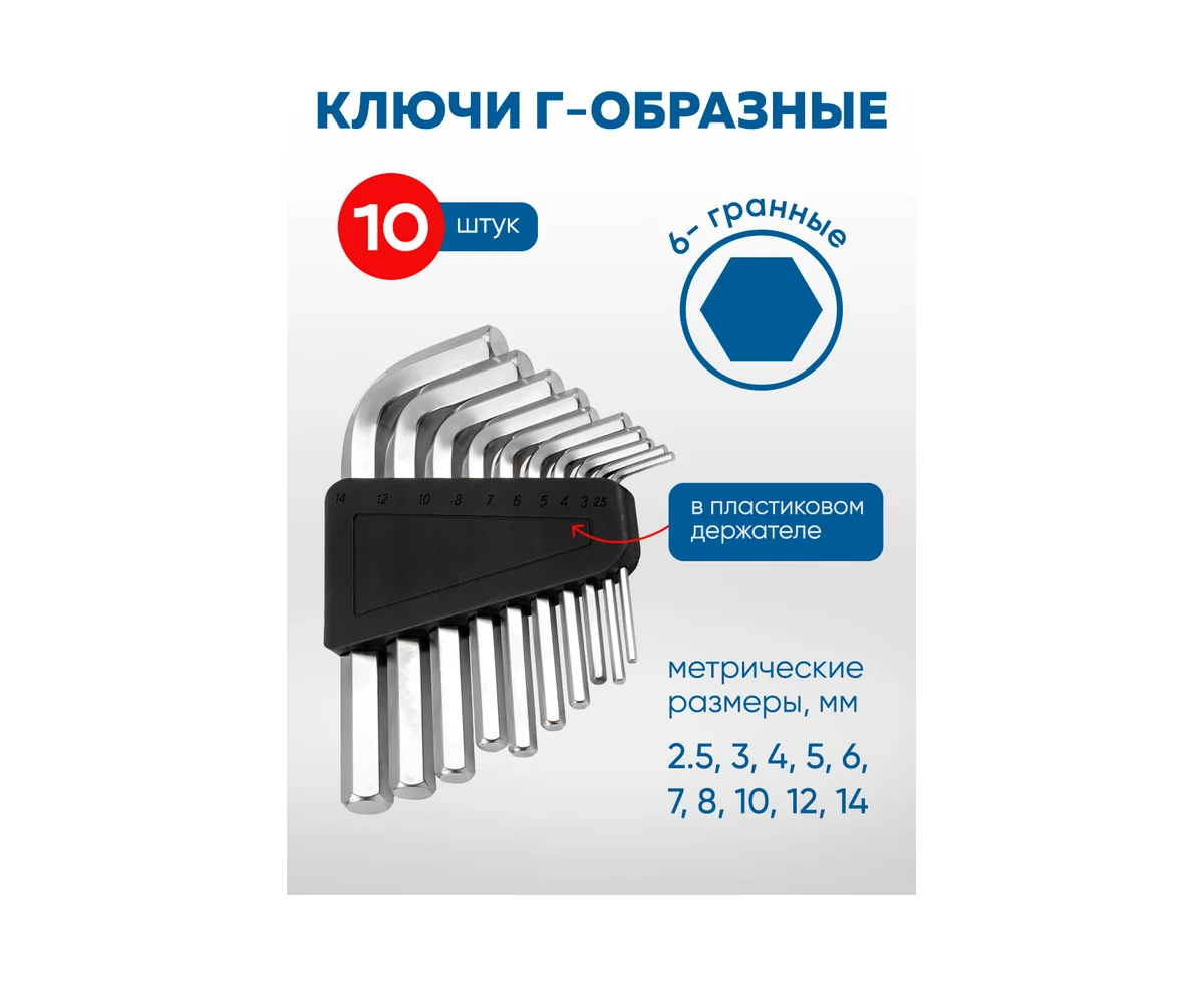 - Ключи 6-гранные Г-образные: 2.5, 3, 4, 5, 6, 7, 8, 10, 12, 14 мм