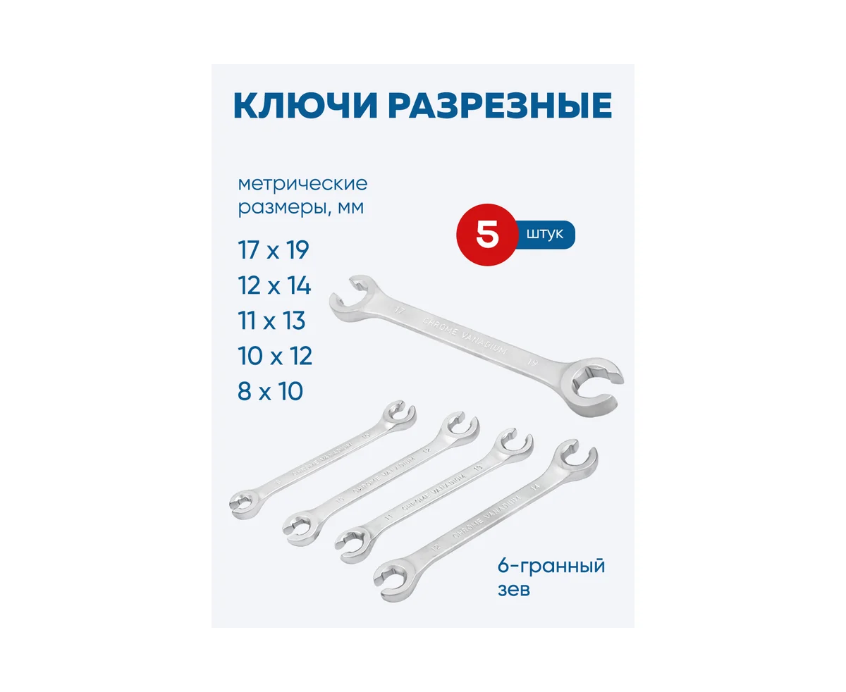 - Ключи разрезные: 8х10, 10×12, 11х13, 12х14, 17х19 мм