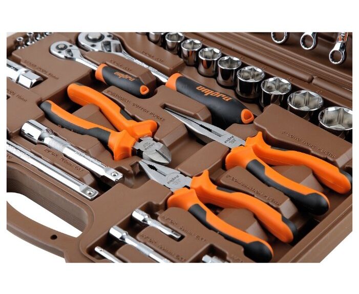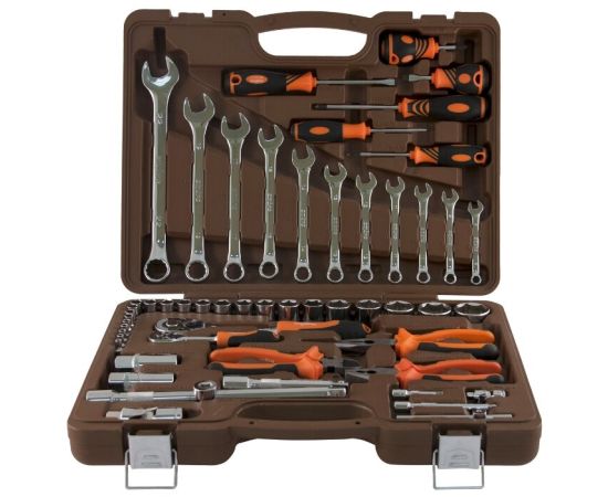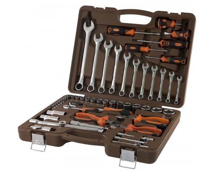 Описание Состав: головки свечные, адаптер трехсторонний, головки короткие, удлинители, ключ трещоточный с быстрым сбросом, вороток т-обр., кардан шарнирный, ключи комбинированные, отвертки, бокорезы, пассатижи, длинногубцы, пластиковый кейс.