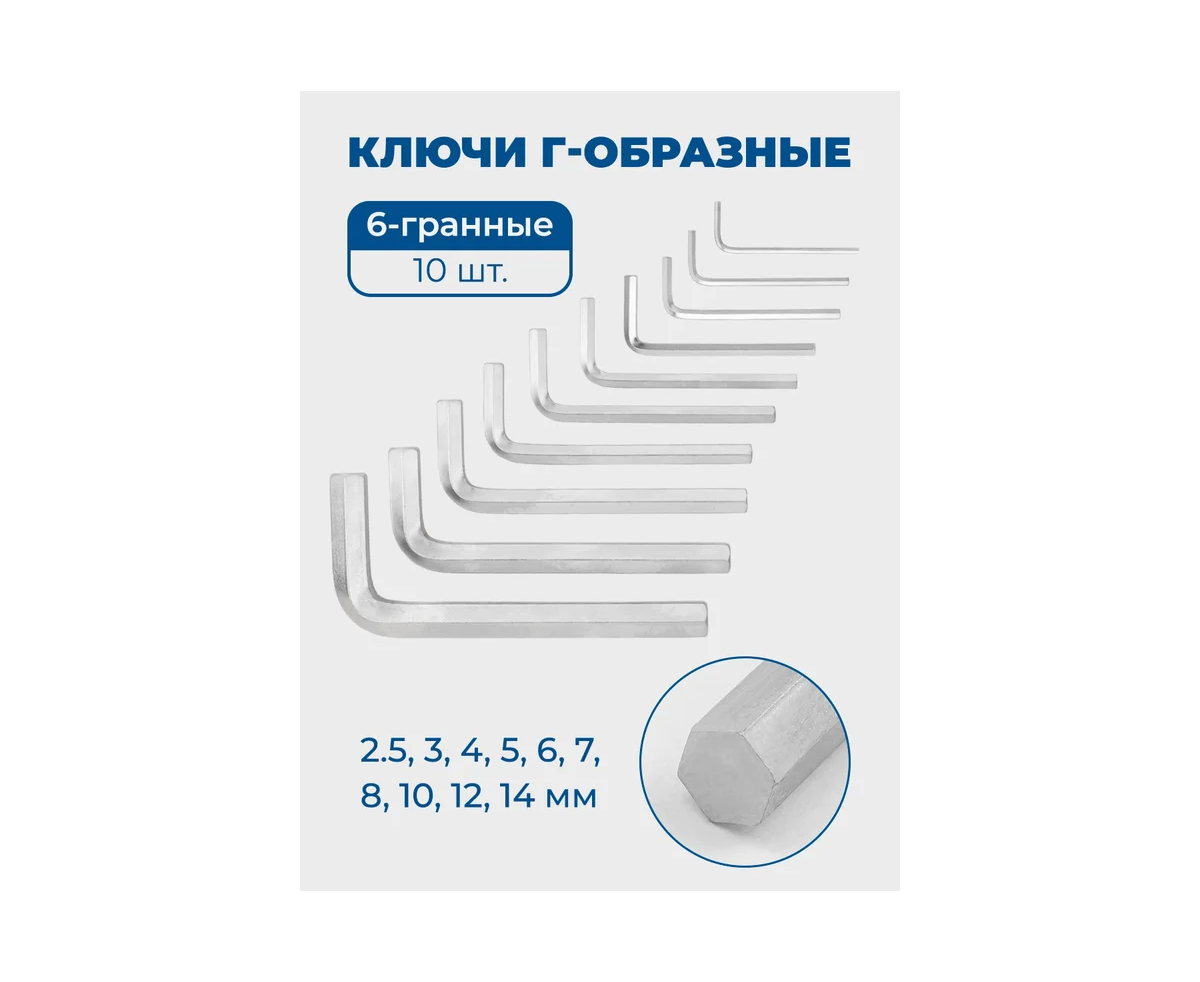 - Ключи шестигранные Г-образные 2.5, 3, 4, 5, 6, 7, 8, 10, 12, 14 мм. - 10 шт.;