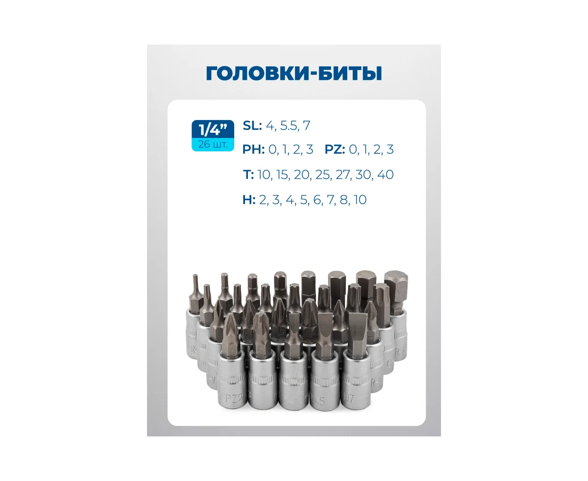 - Головки-биты 1/4" H2, H3, H4, H5, H6, H7, H8, H10; T10, T15, T20, T25, T27, T30, T40; SL4, SL5.5, SL7; PH0, PH1, PH2, PH3; PZ0, PZ1, PZ2, PZ3 - 26 шт.;