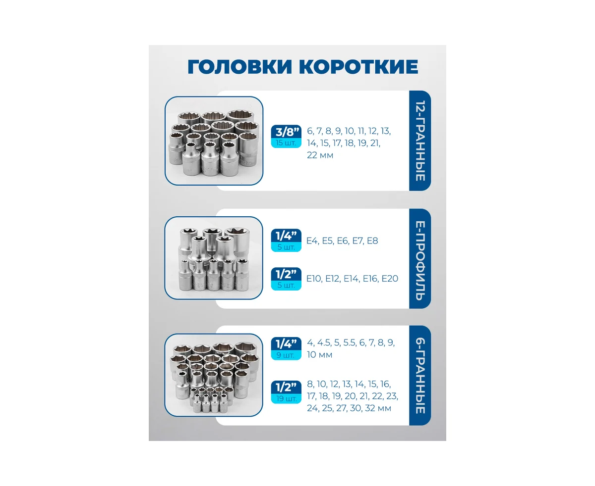 - Головки 1/2" короткие шестигранные 8, 10, 12, 13, 14, 15, 16, 17, 18, 19, 20, 21, 22, 23, 24, 25, 27, 30, 32 мм. - 19 шт.;
