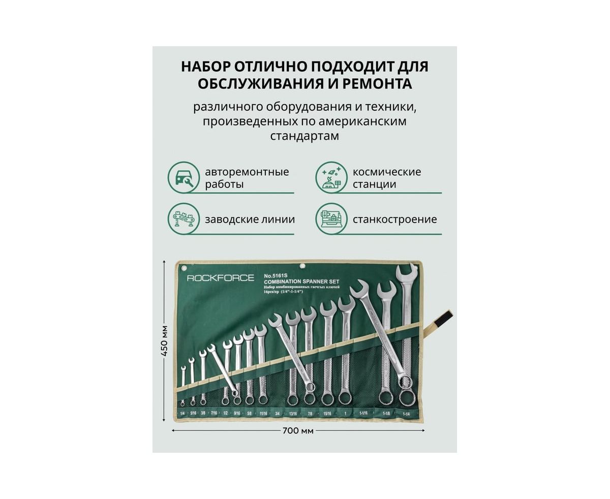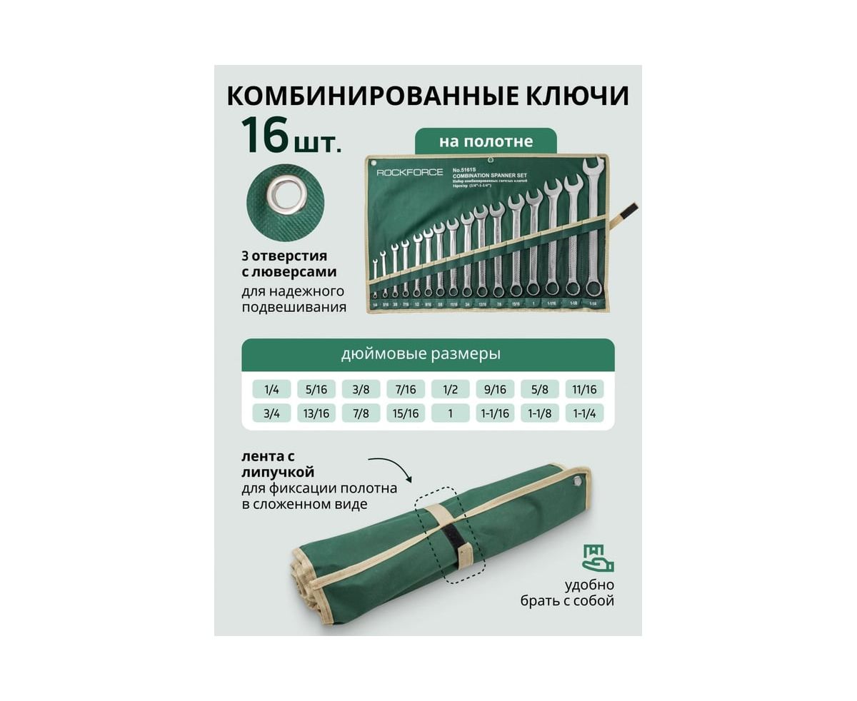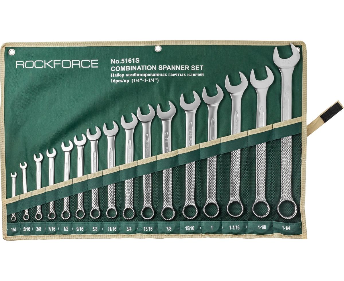 1.Набор комбинированных дюймовых ключей ROCKFORCE 16пр. на полотне RF-5161S устойчив к коррозии