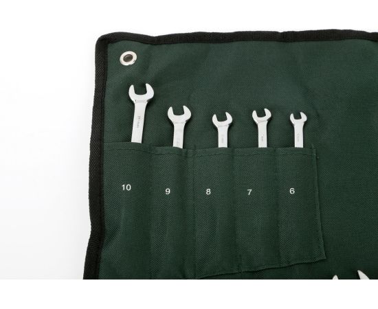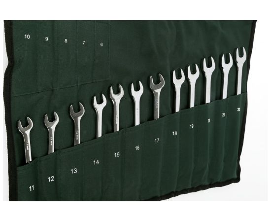 Набор комбинированных ключей с накидным наконечником включает в себя большое количество двусторонних ручных инструментов с кольцевыми и рожковыми головками для выполнения крепежных операций в широком диапазоне размерности болтов и гаек. Набор очень прост в хранении и транспортировке благодаря удобному чехлу с отдельными карманами для каждого компонента.