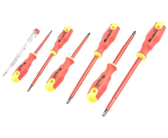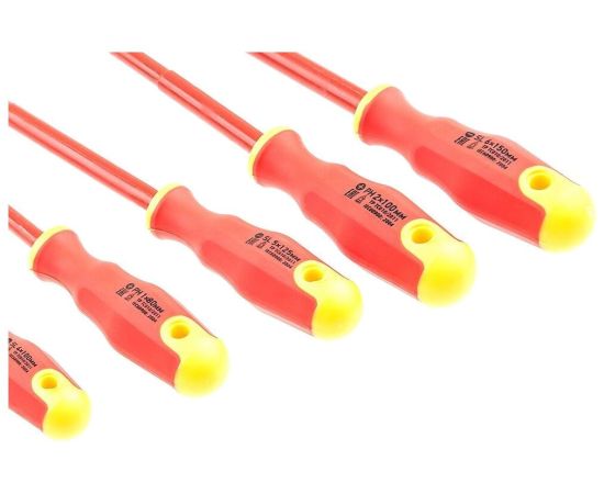 Набор диэлектрических отверток до 1000В обладает диэлектрическим покрытием стержня, что позволяет использовать инструмент с крепежными соединениями, находящимися под напряжением до 1000 В. Стержень изготовлен из хромованадиевой стали. В комплекте поставляются отвертки с прямым и крестовым шлицами, а также индикаторная отвертка для определения напряжения в сети. Рукоятки изготовлены из двухкомпонентного материала.
